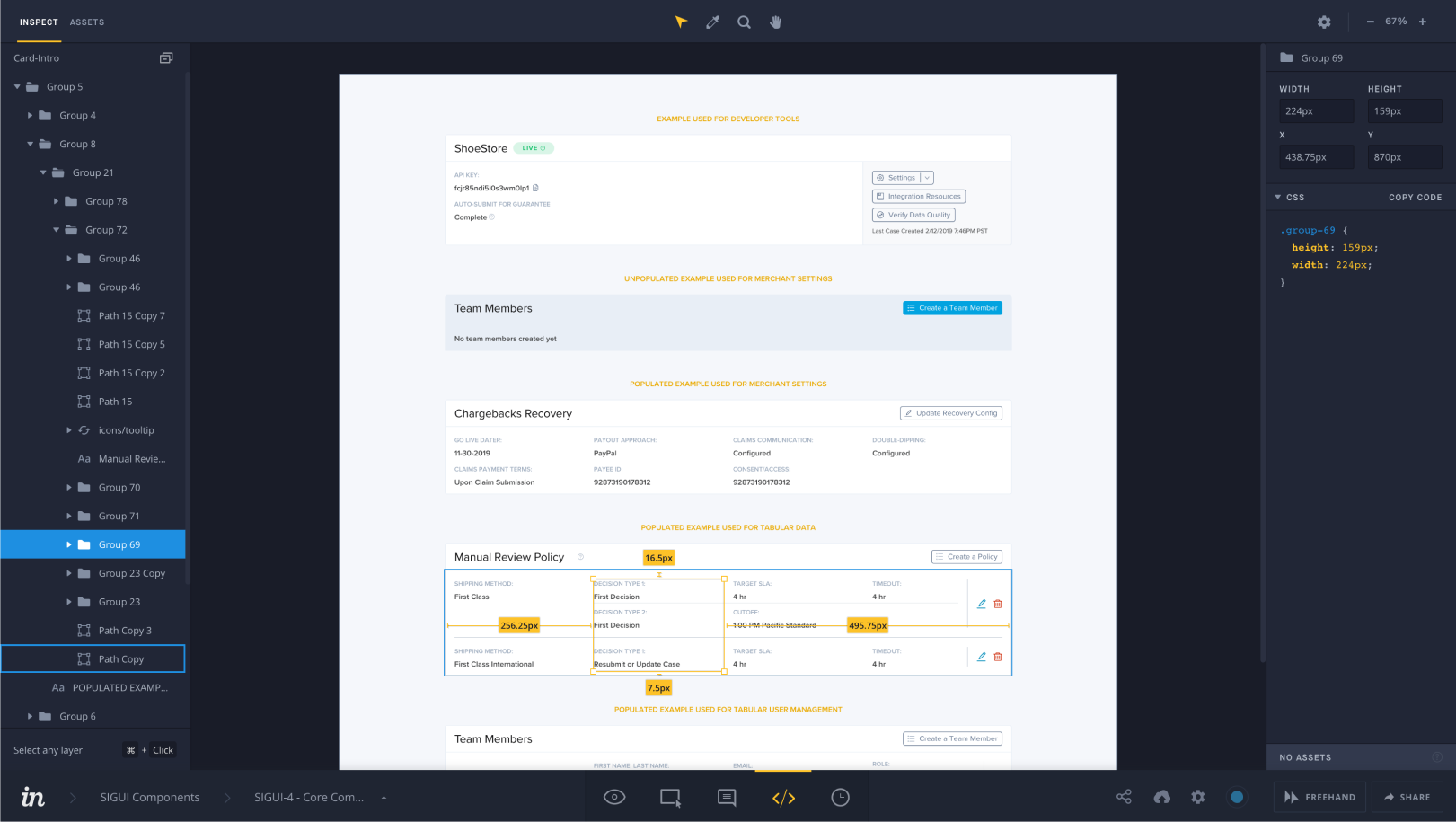 InVision provided Craft, a Sketch plug-in integrating design system elements between InVision DSM and Sketch, and Inspect, which gives developers access to detailed CSS code and specs.